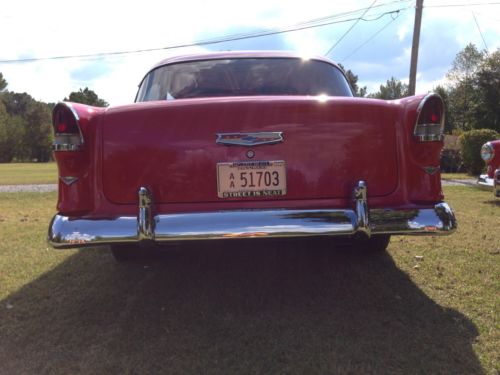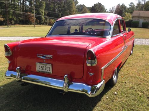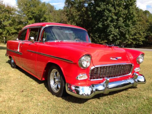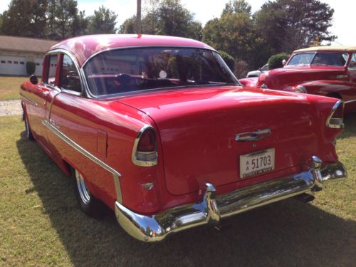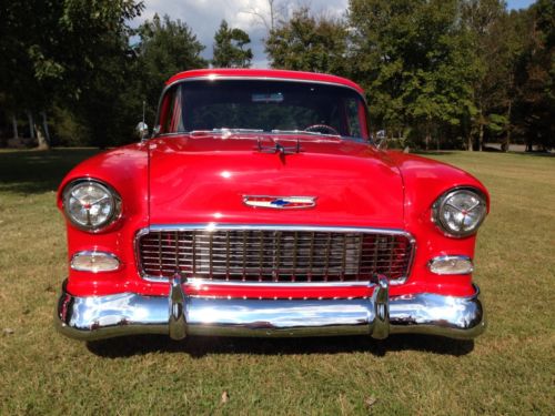 Up for sale is a fully restored frame off custom 55 Chevy Belair 2d post. This car comes equipped with the following nova front sub-frame, 496 stroker with 4 bolt main, air gap intake, aluminum heads, msd distributor and wires, roller comp cam, electric exhaust cutouts, over sized oil pan, turbo 400 transmission with stall speed converter, 300 posi track with 9" ford, mini tub, ididit tilt wheel, power windows and seats, vintage air, classic instrument guages, fully custom interior and trunk, custom headliner with flow through console, secret audio head unit with audiobahn sub and amp, cd changer, bluetooth and ipod hookup,polished american torque thrust wheel - front 6" and rear-10", billet dash insert, all stainless redone and polished, aluminum radiator, hydro-boost brake system, all new glass and rubbers,new grill, triple chrome plated bumpers, paint color is correra red (cr3 code).this is some of the major parts too much to list got questions feel free to contact Lloyd @ 423_309_8628..or 423_476_5681.. thanks for looking