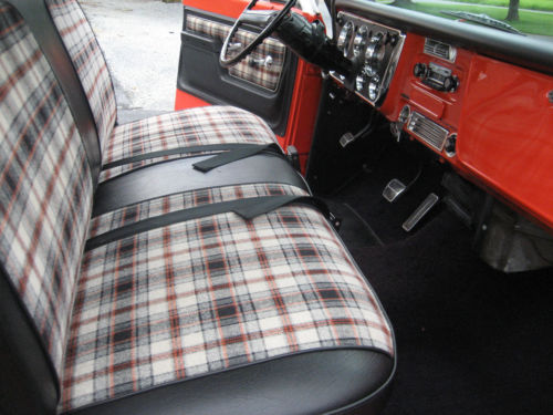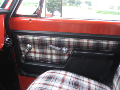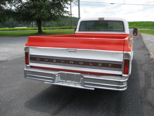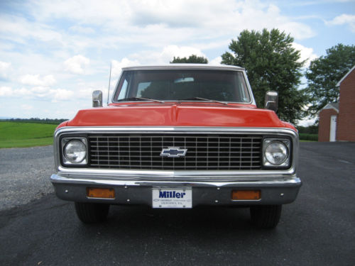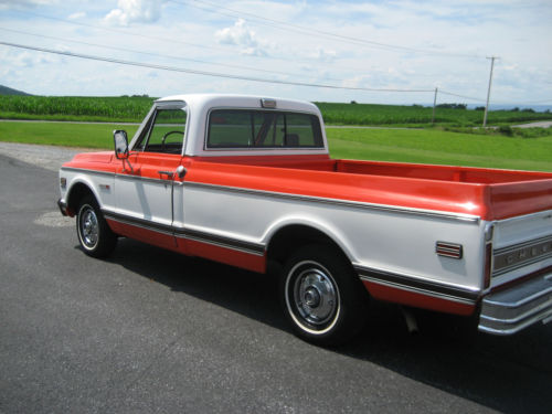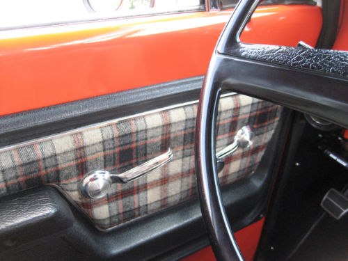 1972 Chevy Cheyenne, original Hugger Orange truck and the last year for this color. Only 2 previous owners. Never advertised for sale before. An original 65,000 miles truck documented by the title and inspection records, with original build sheet and manual.This truck was ordered with many options, including 12volt positraction rear, heavy duty front and back sway bars, 350 Chevy small block engine . Cheyenne orange and black plaid interior , in perfect condition, check the pictures for close up. Tilt steering wheel, Power steering, Power front disc brakes, AM/ FM factory radio, air conditioning,turbo automatic transmission . Transmission works as it should with no leaks or drips. 350 Chevy engine in excellent condition , does not smoke or use any oil and shifts smoothly. There is no rust, but the rocker panels were replaced in 1999 with GM panels, after that it never went out in bad weather. The wood in the box was also replaced at this time,again check out the pictures . 4 matching Goodyear radial tires.