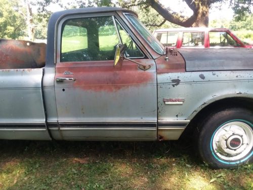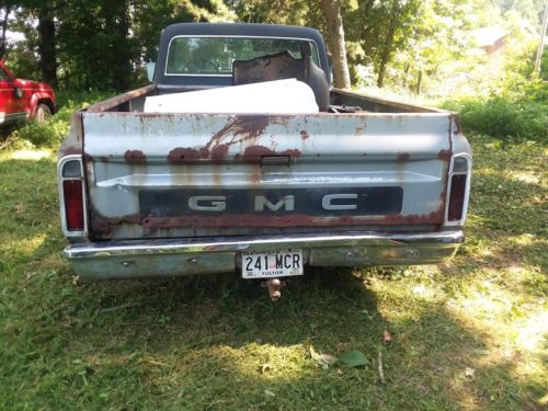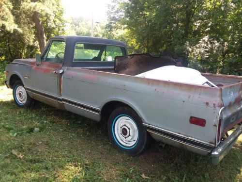 uo for sale is a unique 1969 GMC Longbed c10 with an AC cab, PS, PB, and a host of new parts installed. This truck is still wearing its original Silver Poly paint and even has a cool dealer installed option: a faux vinyl cab top (noted by the brochure in the last picture). While the truck has a significant amount of rust on the bed and a little in the frontend, the AC cab is very solid and only has a few pinholes in the rockers and a small spot in the firewall.