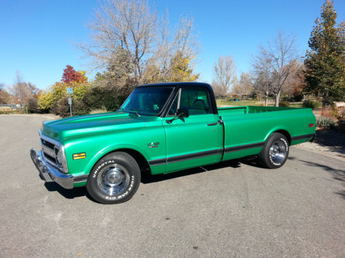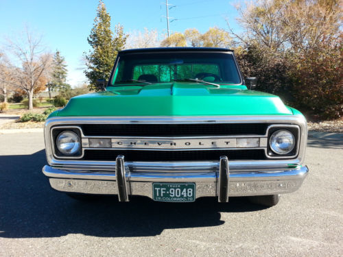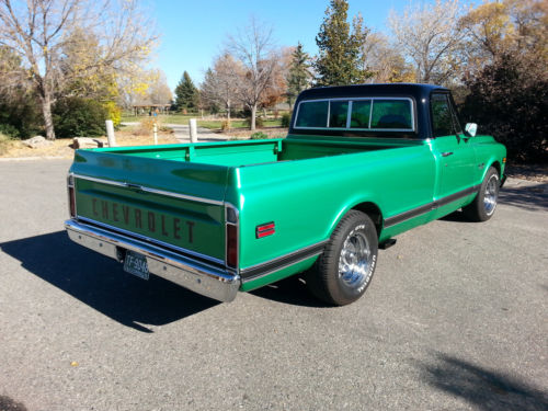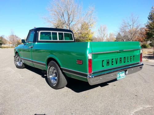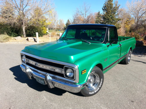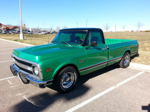 Beautiful 1970 C-10 long bed pickup.This pickup was originally purchased atHayek Chevrolet in Longmont Co.The truck has a 350 small block with aturbo 350 automatic transmission.The engine has been completelyrebuilt, it has corvette double hump heads, roller rockers, HEIignition, edelbrock performer manifold, mild cam, hooker headers andruns great.The transmission has a deep sump aluminum pan, shift kitand a 2,000 stall.The rear axle is a 3.73 posi.The truck has newcorvette style rally wheels, new custom 2 1/2" exhaust and has beenconverted to front disc brakes with 2" drop spindles. The laser straight, rust free body wasprofessionally painted metallic green with a metallic black top using base coat clear coat paint buffed / wet sanded toperfection.This is avery clean, restored, investment grade truck as the pics show.