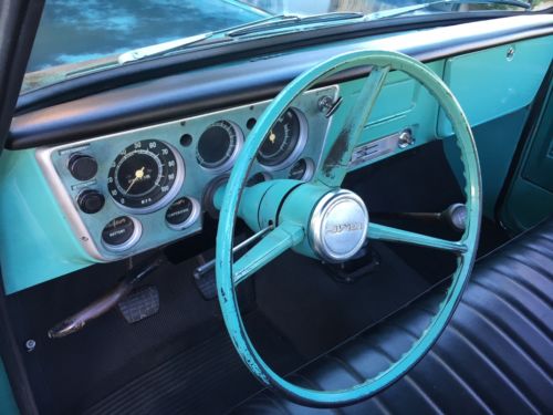 THE BODY AND PAINT - The body on this truck is in over all good condition and the floor pans, kick panels are solid, they look good. The bed sides are original to the truck and do not look to have any old body repairs or any major damage to them. The top of the bed rails and the stake pockets are in good original condition and are not beat up or damaged. The inside of the bed is not beat up or overly abused and the bed bottom is not wavy it's in good condition with light surface rust only. Both of the doors are in good original condition and both of the doors are not rusty: just light surface rust only down low. Both front fenders are also original to the truck. I have checked the passenger side fender down low in-line with the battery and it shows no signs of rust: same with the driver's side, both look good. Both of the front fenders down low where they are usually rusty are nice and dry. Both of the inner fender wells and the battery tray are original to the truck and they show no signs of damage or rust: they look good. The radiator support is also original and it shows no signs of damage or rust and will not need to be replaced. The outer rocker panels and cab corners are original to the truck and they are in good condition. The inner rockers look solid. The body braces are also in good condition and they show no signs of rust. The windshield pillars and upper windshield area both outside and inside are rust free and are in good condition. The rain gutters are in good original condition with light surface rust only they show no signs of rot or deep rust. The top of the metal dash down by the windshield rubber is in good condition and it shows no signs of water stains or rust. The hood is in good condition and hood hinges are in good condition and they are not sprung. The floor tunnel and the firewall are clean and rust free and the original paint on the fire wall looks good.This truck has all of its original GM panels and overall the body on this truck is clean for being original. This is an original truck and it has small dings, dents and scrapes throughout. There were old bed hooks mounted on the upper bed side 3 per side that were removed and the small screw holes were pluggedandbrush touched. The doors also had aftermarket side mirrors that were removed and the extra screw holes were plugged and brush touched.The original factory color is light green and the original patina paint has thin spots, nicks and chipsthroughout but this truck has a great patina shop truck look that is not fake.