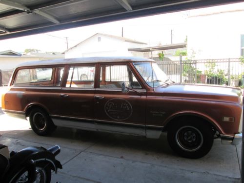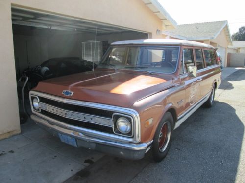 HI! you are looking at a original California C10 396 suburban, with original paint.. Runs and Drives Good.. It does have some rust, as shown in the photos.. But it is otherwise solid.. I believe The engine is the original Engine that came with it This is all I can get off of the front under the right head of the block T0105TBG The person that I purchased it from said that it was the original Engine, That it came with I also have the original Air cleaner, And the Valve Covers, as shown in the photos.. I understand that they pretty much make all new patch panels for these Trucks/Suburbans, And I have seen worst I believe that the roof up front is the worst part of the rust situation But the windshield is still intact, There is no signs of this truck completely falling apart. Over all this suburban has got the potential to be a great candidate to restore Or have fun driving it the way it is, I still get thumbs up, It really is a cool looking suburban! If you need some more info give me a call (818) 879-3764 David.