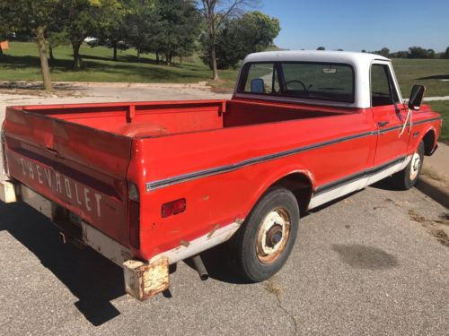 Low Reserve!!! 1970 C20 3/4 Ton 350/350 automatic. Runs and drives good, a good driver. It retains it's original sheet metal and paint so you know what you have here. Has the 16.5 rims which are harder to find. Wood bed all intact. Truck has very minimal for what you typically would see on the C10's but does have some dents and dings. Only rust is some pinholes in cab corners and right back cab mount, right fender below the battery tray. Driver door got sprung or bent back so will need a new driver door but opens and closes fine. Doesnt' leak oil or burn oil, drives straight down the road at highway speed. This is a great restoration candidate. Have more pics upon request. I welcome any and all inspections. Have any questions just ask.