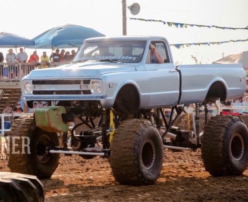 I have a clean 1969 Chevy Monster truck with 2.5 ton axles with lockers front and rear , 672 gears , quick change SCS drop box , custom driveshafts, 20in travel FOA coilovers , limiting Straps front and rear , PSC full hydraulic Steering , built 2wd Trans rated for 1,000 HP , 54 in Boggers on Custom 20x18 Beadlock rims that are powder coated . Gorilla Offroad 4 link custom cradle . The outside is a Dove Blue metallic wrap and under neath is good paint except where the holes for the trim were filled before the wrap was put on . Inside of the cab is black and it has a Orange dash and door panels . Fresh black carpet and seat .The motor is a Built 468 Bigblock Chevy with over the frame Maddog headers . Trucks runs good and sounds mean . This is strong pulling truck and tug of war truck . I do have a weight rack for the front also . Call or text 757-679-5473 for more info or pics