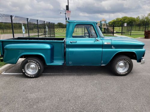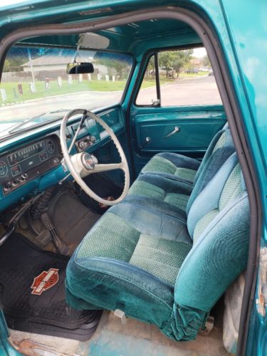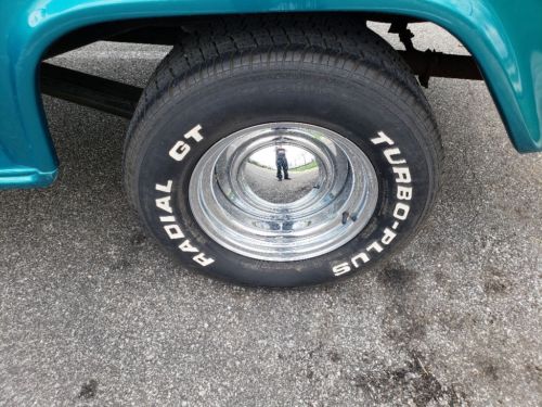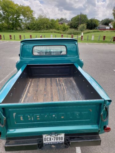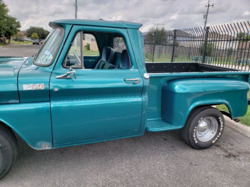 This is a solid 1965 C-10 Stepside with Green exterior and suede interior. The bed has solid wood with Rhinoliner about 10 years old still holding up on inside walls of bed. Im 3rd Owner with clean title. Runs real nice for an oldie, i took care of rust spots just needs bondo.has no power steering, brakes. The bottom is very solid nothing loosened everything is in working order. Just need spray paint.