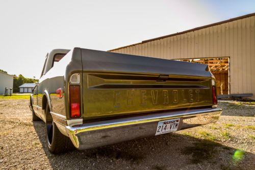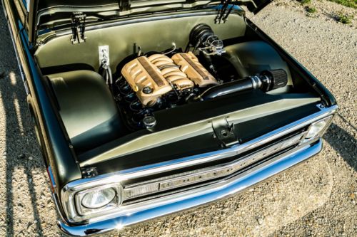 This 1969 Chevrolet C10 pickup has had a body-off restoration frame was blasted and powder coated in gloss graphite along with various suspension components in gloss or satin black. A custom driveshaft with spicer joints is fitted, along with a dual Flowmaster exhaust system and aluminum boyd gas tank with in tank pump all plumbed with braided and steel lines.