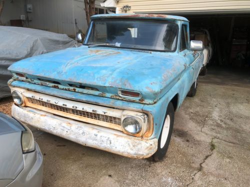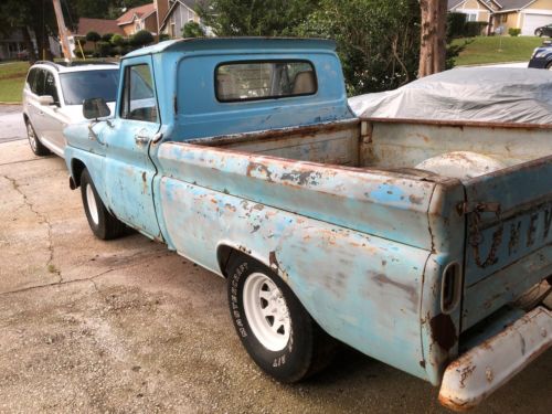 please note truck sold with bill of sale only up for sale 65 chevy c10 short bed with a 350 engine that is not running I think the starter needs replacing. automatic transmission gear shift in the floor works . please look at the pictures some rust not a lot dual headers sounds great bucket seats all glass are good needs freeze plug on engine, I have purchase a new carburetor on the engine also new chrome bumpers front and back and new back tail lights not install on truck yet will go with truck, please note there is a nonrefundable deposit required after auction end and must contact seller after auction ends are vehicle will go to the next higher bidder