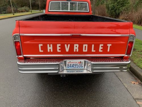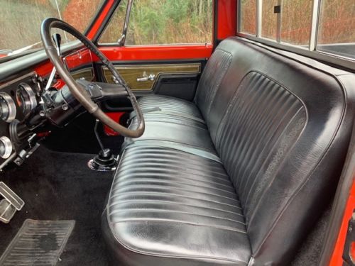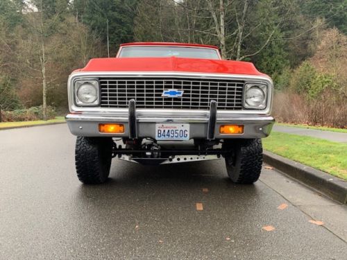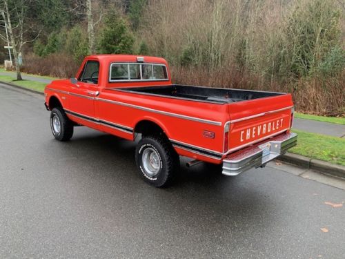 Thank you for taking the time to check out my auction. Please take the time to read my description in full as well as my terms of sale. Up for auction or buy it now is this beautiful Survivor 1972 Chevrolet Cheyenne 4wd pick up truck. I believe this is one of the best examples of a well taken care of unrestored 72 Cheyenne 4wd out there!! Previous owner stated that this truck had been in his family since 1980. His grandfather bought it off a local Chevrolet dealership in 1980. This truck has been well maintained and stored inside ever since. They used it for towing there 20ft boat to the local lake and to the lumber store and what not. The truck was his baby and he treated it as such.The truck still retains its original number matching 350 V8 engine. Sometime in the late 80's they had the original heads rebuilt and installed a new timing chain and a carb rebuilt. The transmission was also pulled out serviced and had a shift kit installed. The previous owner also stated that they took the truck in quite a few years ago and had some small paint repair professionally done and a new clear coat to preserve the original paint. Check out the pics!! This truck looks amazing for being a unrestored truck with mostly original paint. Has a few very minor rock chips down low to be expected from driving. All of the trim,grill,door handles,mirrors and front bumper are original G.M as well. The back bumper is a aftermarket option that was chosen for towing. Also has a receiver style hitch and a brake controller. This truck is as solid as they come!! They rockers are rust free and original as are the floors,cab braces and mounts,kick panels,cab,corners,windshield frame as well as the rest of the truck. I have pictures of the underside as well. The truck has never been undercoated as well. Nothing to hide on this beauty!! This truck is obviously the highly sought after original Medium red/ Hugger orange with Black saddle scroll interior with factory tilt wheel,factory rear window slider,factory tinted glass,factory manual throttle control,has a factory tach but was added along the way as was the chrome ashtray,glovebox door and heater box. Comes with the original build sheet and manuals.. Has a uncut dash with a Pioneer 2 knob AM/FM cassette stereo with two Pioneer 6x9 speakers. About 6 years ago the grandfather passed the truck down to his grandson. He added the new 4inch rancho lift,32inch BFG all terrain tires,rebuilt the front end,new brakes,stainless headers and dual exhaust with Flowmasters. That's were I came into the picture. I collect 1967 thru 1972 Chevy pick ups and K5 Blazers. This truck was so nice I could not pass it up. All the body lines are great. The doors click shut with your finger. The truck run's and drives as good as it looks. I drove it home 65-70mph for 2 hrs down the freeway with no problems at all.I drive it all the time. My Duramax has been sitting since I bought the truck!! lol. The steering is tight. Holds great oil pressure and temp. The brakes work great. Everything works on this truck like it did from the factory. Not very many out there that are like this without a huge $$$ frame off restoration. They are only original once! This is a true turn key driver that you could take anywhere. I have other priority's right now or believe me this one would be staying in the collection. Truck attracts a lot of attention. Be fore warned that if you buy this truck you will have to get used to 1/2hr conversations every time your putting gas in it!! If you have been in the market for a super solid survivor truck with great options and colors you might want to check this one out. These trucks are gaining in value like crazy as I am sure you are well aware of if your reading this. This truck is a solid investment that will only keep gaining in value for the new owner. I have priced this truck reasonably and to sell.
