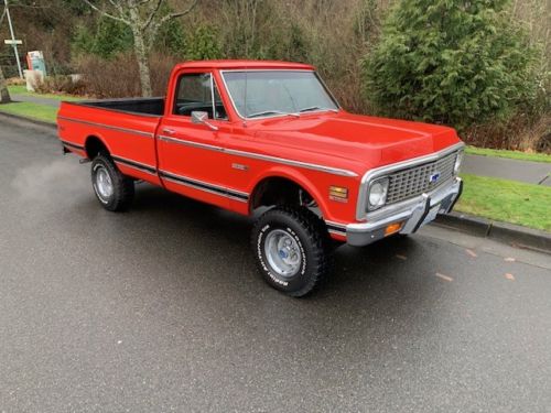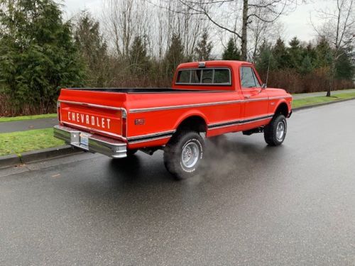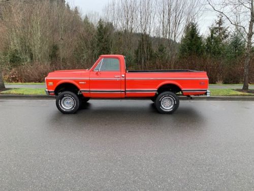 Thank you for taking the time to check out my auction. Please take the time to read my description in full as well as my terms of sale. Up for auction or buy it now is this beautiful Survivor 1972 Chevrolet Cheyenne 4wd pick up truck. I believe this is one of the best examples of a well taken care of unrestored 72 Cheyenne 4wd out there!! Previous owner stated that this truck had been in his family since 1980. His grandfather bought it off a local Chevrolet dealership in 1980. This truck has been well maintained and stored inside ever since. They used it for towing there 20ft boat to the local lake and to the lumber store and what not. The truck was his baby and he treated it as such.The truck still retains its original number matching 350 V8 engine. Sometime in the late 80's they had the original heads rebuilt and installed a new timing chain and a carb rebuilt. The transmission was also pulled out serviced and had a shift kit installed. The previous owner also stated that they took the truck in quite a few years ago and had some small paint repair professionally done and a new clear coat to preserve the original paint. Check out the pics!! This truck looks amazing for being a unrestored truck with mostly original paint. Has a few very minor rock chips down low to be expected from driving. All of the trim,grill,door handles,mirrors and front bumper are original G.M as well. The back bumper is a aftermarket option that was chosen for towing. Also has a receiver style hitch and a brake controller. This truck is as solid as they come!! They rockers are rust free and original as are the floors,cab braces and mounts,kick panels,cab,corners,windshield frame as well as the rest of the truck. I have pictures of the underside as well. The truck has never been undercoated as well. Nothing to hide on this beauty!! This truck is obviously the highly sought after original Medium red/ Hugger orange with Black saddle scroll interior with factory tilt wheel,factory rear window slider,factory tinted glass,factory manual throttle control,has a factory tach but was added along the way as was the chrome ashtray,glovebox door and heater box. Comes with the original build sheet and manuals.. Has a uncut dash with a Pioneer 2 knob AM/FM cassette stereo with two Pioneer 6x9 speakers. About 6 years ago the grandfather passed the truck down to his grandson. He added the new 4inch rancho lift,32inch BFG all terrain tires,rebuilt the front end,new brakes,stainless headers and dual exhaust with Flowmasters. That's were I came into the picture. I collect 1967 thru 1972 Chevy pick ups and K5 Blazers. This truck was so nice I could not pass it up. All the body lines are great. The doors click shut with your finger. The truck run's and drives as good as it looks. I drove it home 65-70mph for 2 hrs down the freeway with no problems at all.I drive it all the time. My Duramax has been sitting since I bought the truck!! lol. The steering is tight. Holds great oil pressure and temp. The brakes work great. Everything works on this truck like it did from the factory. Not very many out there that are like this without a huge $$$ frame off restoration. They are only original once! This is a true turn key driver that you could take anywhere. I have other priority's right now or believe me this one would be staying in the collection. Truck attracts a lot of attention. Be fore warned that if you buy this truck you will have to get used to 1/2hr conversations every time your putting gas in it!! If you have been in the market for a super solid survivor truck with great options and colors you might want to check this one out. These trucks are gaining in value like crazy as I am sure you are well aware of if your reading this. This truck is a solid investment that will only keep gaining in value for the new owner. I have priced this truck reasonably and to sell.