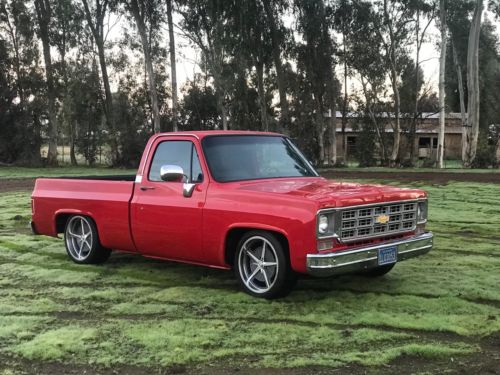 Rebuilt 350 engine th400 automatic trans. Truck runs and drives good with no issues. No rust at all has always been a ca truck. New interior (seat , headliner ,carpet new seat belts ) The seat has custom diamond stitching . Viper red paint that looks very good as you can see in pics. No dents or body damage. ZERO RUST. It was lowered 3" in the front and 4" in the back with DJM suspension parts. 20x8" wheels in the front and 20x10"s in the rear. . Theres no dings or dents and it is super straight. No leaks, no issues everything works. Holds a Clean Ca title If you have any questions please contact me for further details. New edelbrock carb and air cleaner. Truck fires right up and has plenty of power.