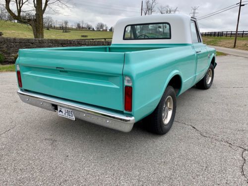 i have freshly restored 1967 c10 short bed fleet side pick up, just got done with restoration and the truck currently has 400 miles on it since it was finished, it has a 350 chevy that has been freshen up with all new gaskets with a weiand intake a small cam and a new demon 625 carb and the trans is a th350 that i believe to be stock and the rear end is a 4:10 posi trac, its does have powers steering and the truck is set up for power brakes all it needs is a booster and it would be good to go, it does have a custom red oak bed that was made by a cabinet maker and is really the center piece of the truck, whole bunch a has been done and too much to tell in one ad so if you have any questions feel free to message me and thank for looking! here's is a list of some of the new parts on the truck, brake lines, fuel lines, air Filter, exhaust and mufflers, all new sheet metal for bed, front and rear bumper, radiator, rad retainer, shocks, wiper motor, door panel, door panel chrome trim, arm rest, window crank, inside door handle, outside door handle, starter, front inner fenders splash pan, chrome door sill, fender emblems, radio, speakers, transmission cross member, retro hidden antenna, temp sender, all new hoses, ignition wires, u joint, new 275-60-15 master craft avengers, shifter, electric cooling fan, battery, thermostat, fluids, transmission filter kit, seat cover, dash pad, tachometer conversion kit, amp gauge, accelerator pedal and trim, brake pad, rear window seal, windshield seal, door weather seal, lockset, glove box, rear window glass, headlamp bezels, taillamp lens, rear mount gas tank set, stainless fuel filer, carpet, grille molding, sunvisers, bed stripes with bolts, 20 circuit wiring harness, cigarette lighter, headlight knob, cowl vent knob, wiper knob, knob bezels, instrument bezel 7 hole, turn signal lever, center caps, billet radio bezel, beauty rings, wiper arms, dome light, new brakes front and rear, lug nuts, oil pressure sender, oil pressure gauge, heater core, chrome valves covers and breather, alternator, engine gasket set, lokar kickdown cable, coolant recovery jug, hood, hood hinge, and I'm sure I'm forgetting some items but i think i got the majority,