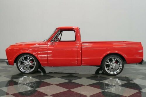 The snarling 350 cubic inch small block V8 would definitely be at home in a slick Camaro, and this relatively lightweight pickup makes good use of the horsepower on tap. It's based on a 4-bolt block, and all the good stuff is here, including an Edelbrock 4-barrel carburetor on an aluminum intake, and an HEI ignition system to light it up. It looks fantastic with Chevy Orange paint on the black, slick painted inner fenders and firewall, and finned valve covers and an open-element air cleaner. Long-tube headers dump into a custom dual exhaust system that tucks up into the frame for good ground clearance on this lowered pickup and produces an awesome soundtrack at full throttle. The 700R4 4-speed automatic transmission was built with performance in mind that makes it feel snappy around town, and because it has overdrive, highways and long-distance cruises are a breeze. There's also a rugged 12-bolt rear end, probably necessary with those giant rear meats, as well as an updated suspension that gives it that awesome stance. The look is turned up to 11 with those 22-inch Boss Motorsport chrome wheels wrapped in 265/35/22 performance blackwall radials all-around.