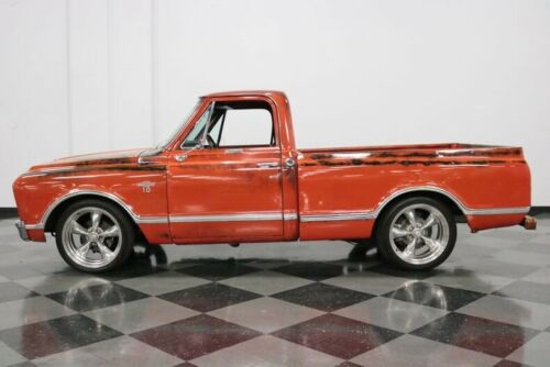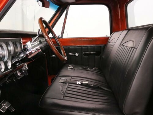 The interior, however, has received a full makeover, complete with beautifully stitched black seat covers with orange piping. Matching carpets and door panels tie it all together, and you'll note that even inside, the original paint was preserved, not wiped out, so someone's elbows have rubbed off the paint on the window sills. Modern Dakota Digital gauges fit into the original panel and there's a nicely fitted dash pad on top and a great-looking wood-rimmed wheel to warm things up a bit. For entertainment you get an AM/FM/iPod stereo in the original radio's slot and there's a custom panel under the dash for the Air Ride system, complete with matching gauges. A new aftermarket A/C system has been installed and works great with modern R134a freon and uses the stock controls in the dash. A modern tilt steering column has a shifter for the 4-speed automatic transmission, so getting behind the wheel will feel instantly comfortable if you've driven any recent pickup.