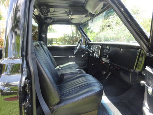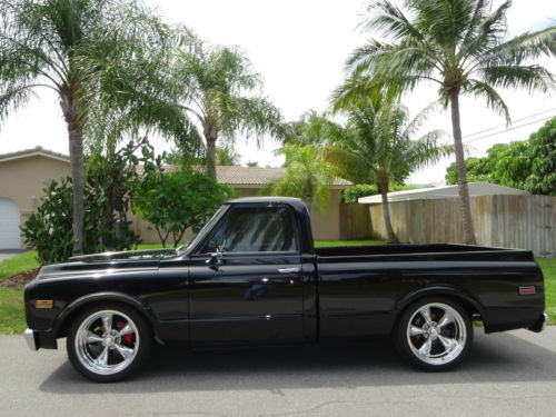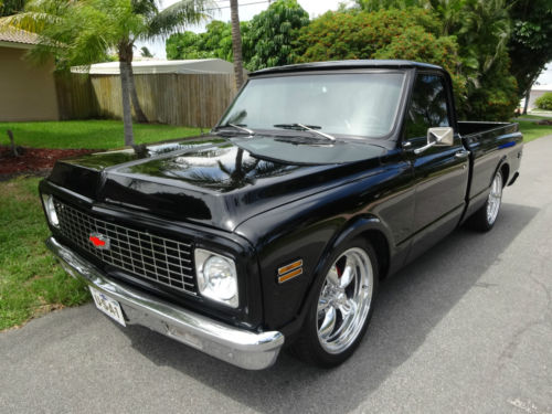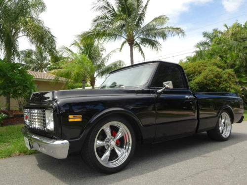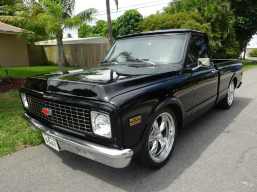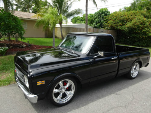 1971 Chevrolet C-10 Shortbed Fleetside Pick-Up, this truck is an older Frame Off Restoration. The odometer reads 22,750 which I believe are the miles it has been driven since the frame off restoration. I just put new 20" Staggered American Racing Wheels, 8" front and 10" rear with new Toyo Proxie Tires. Truck has awesome adjustable Air Ride Suspension with dual Viair Compressors (Made in the USA not China junk) and Classic Performance Products Trailing Arms. The stock springs and shocks go with the truck. The truck has great options like Black Factory Bucket Seats and Console, Cold Air Condition, Power Steering with Custom Steering Wheel, Power Brakes that have been upgraded to 4 Wheel Discs from Classic Performance Products and stop Awesome, Factory AM/FM Radio in the Dash, Custom Headliner with built-in Sound System with Boss Stereo Radio and MP3 with built-in Speakers. Custom Ventless Side Windows with Tinted Glass, Chrome factory front Grille, Chrome Bumpers, Factory Gauges including a Rare Tachometer which works perfectly, LED Headlights and Taillights, a custom Aluminum 21 Gallon Fuel with an accurate gauge! Tank has been added to under the bed so there is no fuel in the cab, the newer 383cid 4 bolt engine has been upgraded with an Edlebrock Performer Aluminum Intake with a 750 Holley Carb, MSD Electronic Ignition, Gear Drive (sounds great), Mild Performance Camshaft and a set of Dynomax Headers with Flomaster mufflers that sound perfectI believe its approx. 350hp, has great low end torque. The Transmission is a GM 700R4 automatic with Overdrive and the rear is the Factory 12 Bolt and I believe they are 3:70's, she cruises 70 @ 2250 effortless. The stock cooling system was upgraded with an electric fan, truck runs cool with A/C on in traffic on 90 degree South Florida weather Truck is dialed-in.. runs great in gear at idle with Air on even with the Cam A lot of these older vehicles look good but are not dialed-in, this truck could be a daily driver if you chose. Horn works, wipers work, all the Factory Gauges work, Temp Gauge, Oil Pressure Gauge, and the Fuel Gauge. The Body and Bed are strait and rust free and painted in Gorgeous Tuxedo Black. The paint is Killer as is the whole truck. A lot of time and money was spent to get this truck to this level. The Adjustable Air Ride Suspension is awesome, it rides like a Caddy and can be raised and lowered to your preference, It has Dual Gauges for front and rear and is controlled from in the Console. The Truck has a Clean Florida Title in my name. I may be reached @ 954-234-7223 to answer any other questions or to set up an appointment to see and drive this awesome Chevy Pick-Up. All information believed to be true and accurate with no guarantees or warranties implied. Thanx For Lookin.
