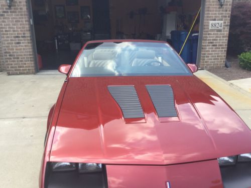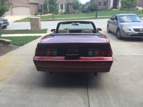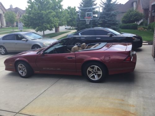 1987 Camaro IROC convertible 5 speed 17k miles. "20th anniversary commemorative edition" Camaro IROC Z Indy Pace Car Convertible. Factory built with less than 1000 manufactured , under 700 of these were IROC Z's. Has unique pouch on the dash with 20th anniversary logo. this convertible has a 305 TPI engine rated at 215 HP with a 5 speed manual transmission. It has the Borg-Warner HD 7.75 four pinion rear end Painted black. Currently has 17750 miles with ORIGINAL 16 inch wheels and Tires. Exterior is burgundy with black top. interior is saddle in leather with two tone seats. Has upgraded chip only modoriginal chip included only one blimish shown in pics. Original radio and speakers are included. Clean CarFax.Title shows exempt miles but the CarFax proofs that mileage is true!!!