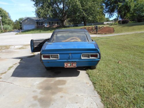 Offering for sale my 1968 Camaro convertible. I started on restoring a few years ago, but now because of age (74) can't do it. It has been setting in my garage since day one it has never been left out. It has NOS rear quarters on it and NOS front fenders to be installed. The engine is a 350 with a hydromatic transmission. The only mods done to motor are Lunati cam, Edelbrock intake with Holley carburetor, and Hooker headers. Some of the new parts I have are; Vintage Air, seat covers, seat foams, door panels, top tanneau cover with bag, weather stripping, trunk weather strip, two nib outside mirrors, carpet, carpet underlayment, new emblems, and convertible top well cover. The car was running when I parked in my garage some 20 years ago. I feel confident with fresh fuel and battery it would run again. The top is in good condition and would last for a few more years. It needs some repair of the floor pans, but I just didn't get it done. If there are any questions please message me and I will do my utmost to answer. If you are close to enough you are welcome to come by and take a look at the car, but please message and set up a time. With all the parts I have you will need some extra space they all won't fit into the car. Now for the business part a $500.00 non-refundable deposit within 48 hours of winning bid, balance due in 7 days of winning bid. All shipping costs are the responsibility of buyer. No warranty. No refunds. I accept certified funds verified by bank or cash. I am also advertising this car locally so I reserve the right to end this listing at anytime. Clear Missouri title.