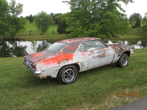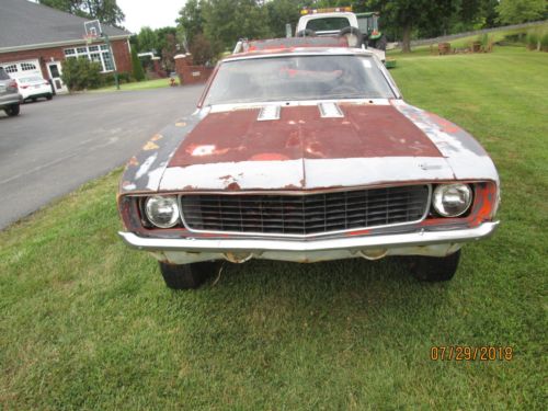 This is a 1969 Camaro RS/SS. Its color is Huggar orange with black vinyl top, black comfort weave interior, molded door panels and wood grain dash. This was an original 350 4 speed car. It has power dis-brakes, power steering, factory tac and gauges. It needs new front sheet metal and the floor pans need to be replaced. Also, one of the outer rockers needs to be replaced or repaired. You could maybe patch them. It needs new quarters and outer wheel housings, trunk lid and partial trunk pan. The roof and deck panel and around the windows look good. The inner fenders look okay. It has the rally sport headlights with the rear backup lights. It has the correct five leave springs. This would be a beautiful car restored, but I have too many project cars. I have a clear Kentucky title. THE WHEELS AND TIRES ARE NOT INCLUDED IN THE AUCTION, I WILL PUT SOME ROLLER TIRES AND WHEELS ON IT!!! With any questions, call 270-792-21twonine.