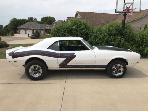 1968 Chevy Camaro. White. 350 V8 with mild cam. 12 Bolt Rear End. 350 Turbo Transmission with B&M shift kit and a B&M ratchet shifter. It gets a second gear scratch! It has a Holley 650 Double pumper carburetor with a Edelbrock Torker II Intake manifold. It has a Mallory Electronic Ignition distributor and Summit Super Coil. It is a fast car. This car was stored from 1990 to just recently. New fuel pump, water pump, starter, alternator and battery. New fuel tank.