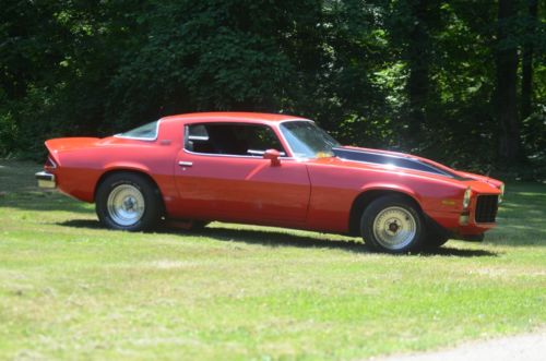 Hello, I am selling my 1977 Camaro, This camaro as you are wondering is a 1977 body with a 1973 camaro nose on it. I have had this car for many years and have put a lot of time and effort into restoring this vehicle and turning her into a resto mod type of car.This car runs great and is a great cruiser you could take anywhere and be very dependent on. This car will surprise you on how well she handles in turns for a muscle car and has enough speed to do it. I have had this car for many years and would like to part with it now because I just don't have the time to use it as much as I would like to and it is a shame and costs me money to hold on to her. Please feel free to ask any questions about the car and take a look at a list of the mods done to the car. Thank you and good luck bidding