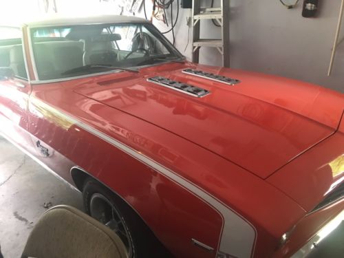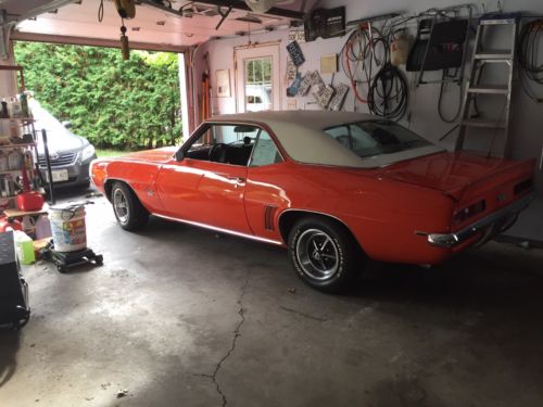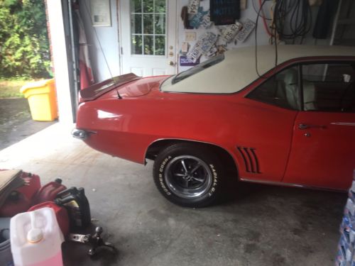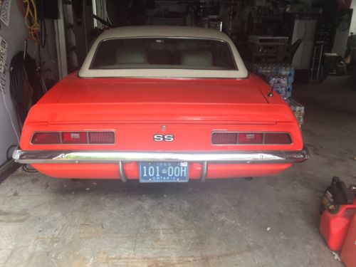 This is a 2 owner fully documented Camaro SS. Car was purchased on July 21, 1969. I have the original invoice and the protecto plate. This is not a recreation or clone SS. I bought the car from the original owner and it underwent a frame on restoration at that time.about 15 years ago. It was stored in his garage for 17 years after he quit driving it. The car was sent to a body shop and needed a new trunk pan, the door bottoms were patched. The rest was solid. A new full trunk pan was installed and 2 NOS doors were located and installed. Not reproduction doors but original GM doors. Car received a new deluxe houndstooth interior, carpet and dash pad after receiving a great coat of Hugger Orange paint.