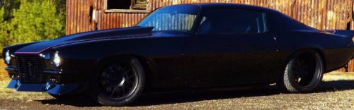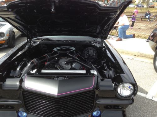 Pro touring car, Detroit speed mini tubbed with ford 9”, roll cage with 5 point harness. Rotisserie build. Hotchis suspension, 4wheel disc brakes. Has small block and 350 turbo w 3600 stall and efi, needs block. Comes with crate ls3, supercharger and new tremic 5speed. Entire body smoothed over, raised glass, shaved handles with trunk and door pops. See video of car on website for Scotty D TV under 1970 camaro street machine.