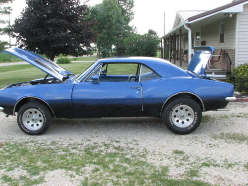 Purchase in 2000. GROUND UP RESTORED: 1967 Chevy Camaro SS w/non matching 327 ci double hump heads, bored .30 over, milled cam, complete head job from Feasel Engine Services. (original) 3 speed transmission(gone thru by expert transmission). Hurst Shifter. Mono springs to 3 leaf springs on rear, New coil springs up front for small block, Power steering added & gear box. All new brake lines, Brakes rebuilt all around(drums). New 2 core radiator, 650 Eldebrock 4BBL carburetor. Original bumpers-door panels, Seats reupholstered, New Headliner and visors, New dash pad & windshield, New rear quarter panels, Front fenders and inners, Air shocks, front shocks, New trunk lid & spoiler, New trunk mat, New Battery, 71' Monte Carlo mirrors, Under body was wire wheeled and repainted, Emergency brake works. Body is painted Blue w/black on bottom. American Racing Rims w/Cooper Cobra Radial G/T P275/60R/15 tires, Car had 117,773 miles when put back on road in 2008, Now has 119,995 miles now. very nice restore camaro..Car is offered for sale locally and auction may end at any time.