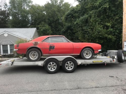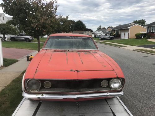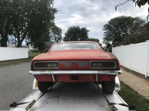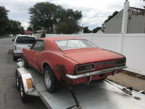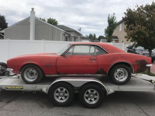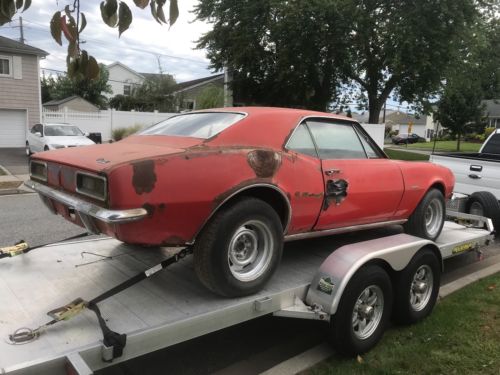 I'M SELLING MY 1967 CAMARO THAT I PULLED OUT A GARAGE IT'S BEEN SITTING IN FOR THE PAST 24 YEARS. THE MOTOR WAS STARTED EVERY NOW AND THEN AND WAS LAST STARTED 3 DAYS AGO AND IT RUNS VERY STRONG. IT WAS REBUILT ALONG WITH THE M21 TRANNY AND NEW CLUTCH AND ONLY HAVE ABOUT 3000 MILES ON THEM. THE TRANNY AND MOTOR ARE HOOKED UP BUT NEEDS THE ALTERNATOR AND HOSES HOOKED UP ALONG WITH THE 4 SPEED SHIFTER PUT BACK ON. IT HAS ALL THE PARTS FOR THE SHIFTER IN A BOX AS SHOWN IN THE PICTURES. THE BRAKES WILL NEED TO BE DONE! THE REAR FRAME RAILS ARE NOT BAD AND SHOWN IN THE PICTURE THE PASSENGER REAR HAS A FEW SPOTS THAT NEED ATTENTION. IT NEEDS A FULL TRUNK PAN ALONG WITH LEFT AND RIGHT FLOORS PANS BECAUSE THE DRIVER AND PASSENGER FRONT HAVE HOLES. THE ROCKERS ARE NOT THAT BAD AND CAN USE A SMALL PATCH HERE AND THERE BUT IN MY OPINION DO NOT NEED TO BE CHANGED. IT IS RUNNING OFF A 3 GAL. GAS TANK IN THE TRUNK. IT WILL NEED TO BE RESTORED SO I FEEL THAT IT'S FOR SALE FOR A FAIR PRICE. I'M SURE I'M FORGETTING A LOT SO IF YOU HAVE ANY QUESTIONS PLEASE, PLEASE ASK AND DON'T ASSUME ANYTHING!!! IF YOU BUY THIS CAMARO I WANT YOU TO BE HAPPY WITH IT!! SO PLEASE ASK QUESTIONS!! PLEASE DO NOT USE THE BUY NOW UNLESS YOU ARE ABLE TO SEND A NON REFUNDABLE $500. DEPOSIT AT THAT TIME! THESE AUCTIONS TAKE TIME AND COST MONEY!! THANK YOU FOR LOOKING AND HAVE A GREAT DAY!!!