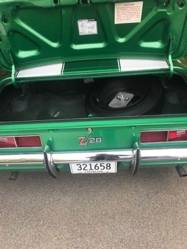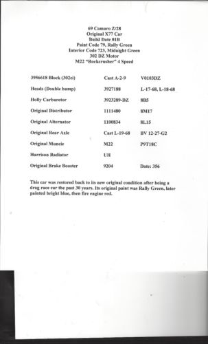 One of the best in the Country! Frame off restored 69 Z28, Rare and original color of Rally Green, with Dark Green interior. This car was a drag car for nearly 30 years, recent restoration back to original specs. This car is immaculate, recent professional frame off restoration. Restoration photos and more pictures are available for serious buyers. Many original parts were used in the restoration, including carb, distributor, rear axle, original M22 transmission, etc, etc. Documented with Original Protecto Plate.
