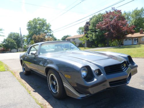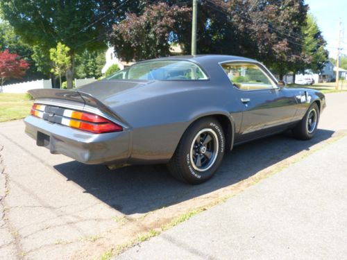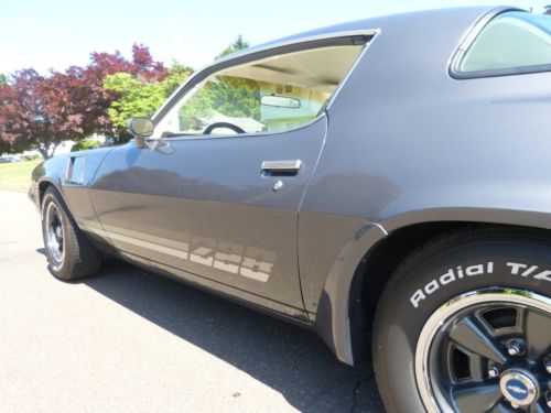 UP FOR AUCTION UNMOLESTED, UNMODIFIED, Z/28 CAMARO WITH STRONG RUNNING 350 MOTOR, SUPER STRAIGHT SUPER RUST FREE SUPER NICE BASE COAT CLEAR COAT CHARCOAL GRAY METALLIC EXTERIOR I WOULD RATE A 8 OUT 10, WITH OYSTER INTERIOR. APPEARS TO HAVE ALL ITS ORIGINAL EQUIPMENT STILL INTACT INCLUDING: SUPER NICE INTERIOR AND GLASS, ORIGINAL NICE FITTING BODY PANELS & TRIM,RUST FREE FLOORS, TRUNK, FRAME RAILS, ORIGINAL QUARTER PANELS AND ORIGINAL STYLE 2 INTO ONE EXHAUST WITH CATALYTIC CONVERTER. STRONG RUNNING 350 CI. ENGINE (TRUE MILEAGE UNKNOWN ODOMETER SHOWS 133K) THAT STILL HAS ITS ORIGINAL SMOG EQUIPMENT INTACT REBUILT BY PRIOR OWNER IN EARLY 2000'S. AUTOMATIC TRANSMISSION WITH POSI TRACTION REAR END. NEWER BF GOODRICH RADIAL TA TIRES ON 5 SPOKE BODY COLOR Z/28 WHEELS