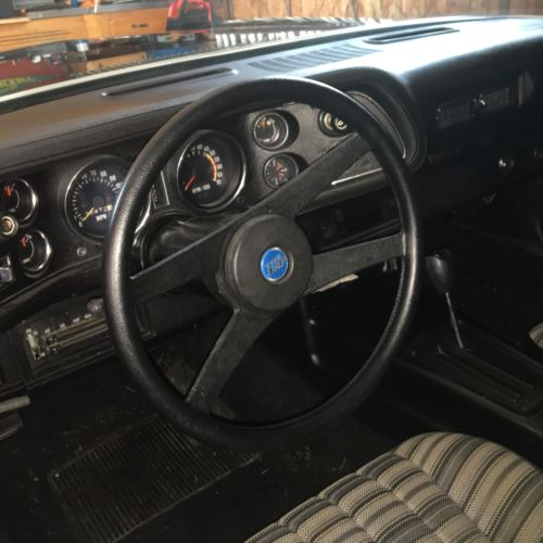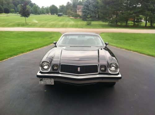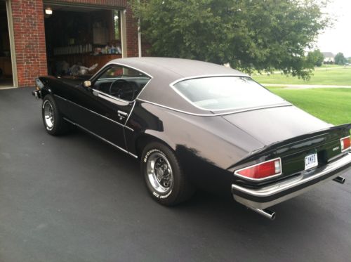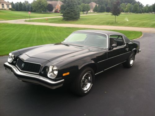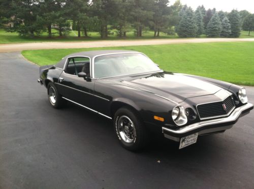 1974 Chevrolet Camaro. Black with Black interior. Original rally rims. The car has matching number 350 automatic V-8 2-barrel car with automatic transmission. The motor runs good and has had all the gaskets/seals replaced since I purchased it. New Master Cylinder two years ago. There have been no modifications to the drive train. I have replaced the dash and front windshield. The rest of interior is in good shape but could use a little tender loving care. The paint is new 4 years ago with a clear coat finish. Really nice looking paint job, but could use a good bluffing. Most of the chrome has been either replaced or buffed out to original condition. The body is straight and drives excellent. Excellent driver and with a little more work could be a great car.