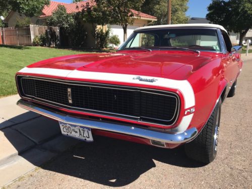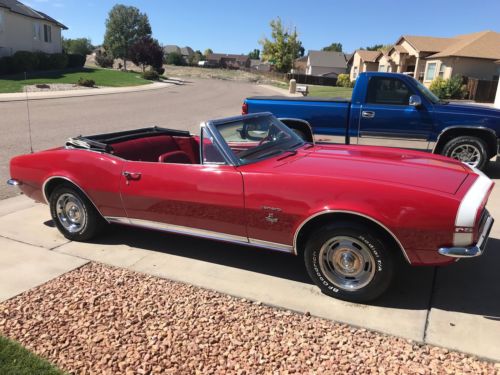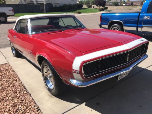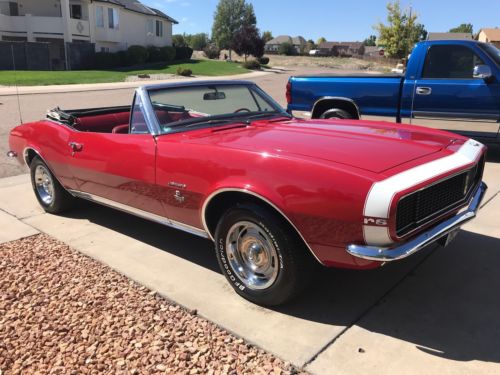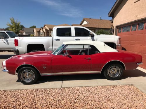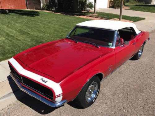 Beautiful 1967 Camaro Rally Sport Convertible in sought after Bolero Red over a bright red interior and new bright white top. Lifelong super clean southern Colorado car. Sold new at Howard Chevrolet in Canon City, Colorado on March 7, 1967 where it spent its life until moving 30 miles away to Pueblo Colorado in 1987. Number’s matching 327, powerglide automatic transmission, everything works like it should including the hidden headlights (work flawlessly), original AM radio and trunk courtesy light. Super tight, never wrecked original sheet metal with beautiful rust free floors and trunk. One older repaint in its original hue back in the early 90s, paint is not perfect but if you are looking for a documented two longtime owner original unmolested example you will be hard pressed to find one as clean as this one. All gaps are perfect, doors open and close extremely nice and solid, all windows operate perfectly. Beautiful glass, interior, runs and drives flawlessly with less than 1,000 miles on professionally rebuilt engine, sounds very nice. Still wearing its original 14” rally wheels, also has a rally wheel spare and original jack and top boot in the trunk. Original owner’s manuals, top manual, protect-o-plate and clear Colorado title. For more photos or questions, please email or call (719)289-8648. This is a NO RESERVE Auction! Thanks for looking and good luck!
