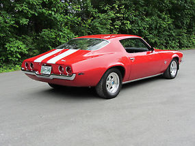 So about the car. It is all factory with a 350 2bbl and a 350 turbo trans. with disc brakes. It runs smooth, no smoke or knocks. Paint is a 6 out of 10 on my scale, it has small chips and scratches here and there. It appears to be painted 10-15 years ago. Interior is stock. Dash pad is buckling a little and it needs a new console door. Since we bought it last year we have put a split bumper and Z28 grille in, and replaced the back dash and sail panels. Also dropped in a new set of speakers. Under the hood we rebuilt the carb, new plugs, dist cap, rotor button, points and condenser. The previous owner said it had a rear end put in while he had it. Its a 10 bolt with the multi-leaf springs. I have a new set of Monroe shocks in the trunk that goes with it as does the original one piece front bumper and grille. Also has a car cover that goes with it and a trunk mat.