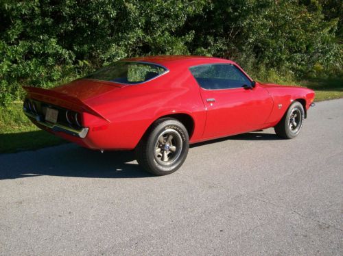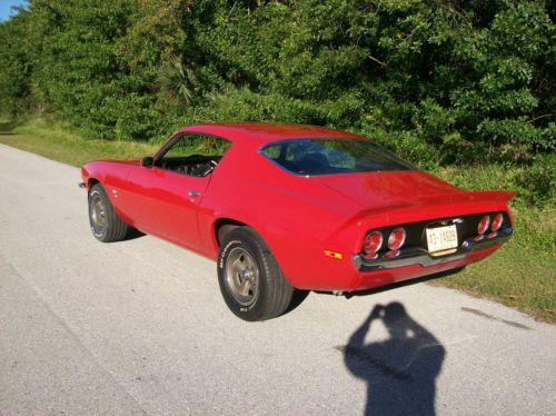 If your looking for that "PERFECT" numbers matching show car, Please Keep LOOKING! This car was built to be Driven. Now with that out of the way, Up for sale is a BEAUTIFUL 72 Camaro R/S-S/S 396 big block 4 speed tribute car. It started life as a 307 automatic Rally Sport with A/C. It had a 350 with a turbo 350 trany in it when I started on it. It now has a 1972 396 that has been completely rebuilt and is out of a 1972 Camaro, a new flywheel, clutch kit, A Completely rebuilt M 20 Muncie 4 speed transmission and the rear end has 3.73 gears with a posi unit. The list of NEW is a LONG ONE. Basically if it moves, it was either replaced or rebuilt. All the break's are new, Rotor's, caliper's, pad's, rear wheel cylinder's, spring kit's, shoes, master cylinder, booster,and all 3 flex hoses. The trunk pan was replaced, as was the tail light panel,1/2 quarter panel's and partial floor panel's. It has new moldings on the windshield and rear window, new header panel, urethane nose ring, new chrome grill ring, new side marker light's, outer door handle's,gas tank and sending unit, it still has a drive shaft loop and frame connectors on it that were installed 20 + years ago. Now for the inside. It's mostly new. new are - seat upholstery front and rear,dash pad, carpeting, head liner, rear sail panel's, lower door panel's, door sill molding's and shifter boot. I'm SURE that I forgot a lot of it. It has a working tachometer, speedometer (I don't think it's accurate) water temperature gauge, volt meter, gas gauge, cigarette lighter, windshield wiper's (new motor) dome light comes on when either door is opened(new door switches)or when the head light knob is turned, even the clock work's, horn beeps, A/C is cold,parking break works, all electrical connections were glass beaded clean to make sure that they make good contact,all light bulb's are new, all switches have been replaced, back up lights come on when the shifter is put in reverse, and new 2 1/2" dual exhaust. Now the thing's that I found not to be working, The A/M radio and the rear window defroster (the blower unit was lost during the build) the car could use a front end aliment as the steering wheel isn't centered. It drives fine. The car's odometer was turned to 000000 so you can keep track of you miles and I've only driven it 1 mile. the engine has run about 1 hour and still has the break in oil in it. Now for the number guy's. The engine block casting # is 3999290, and the date code is A/26/72, head's are 6272292X with date code, Left head E/25/72 and right head E/20/72, intake, 8283769, date A/31/72, carb # 7042220, date K1 EM, distributor, 1112057, date,2A4. The engine is the only thing in the drive train that is 1972. This car was built to be Driven. I'm SURE that I've forgotten a LOT of new things that were put into this car!! I've described this car to the best of my ability. If there is any questions please ask and I will answer them ASAP. Please remember that this is a 47 year old car, not new,I'm selling it to do some much needed home improvements. car can be seen by appointment only. I have a clean open Florida title in my hand.I'm not a dealer. I reserve the right to end this early as the car is for sale locally, sold as is with no warranties implied. CAR NOR TITLE LEAVES MY PROPERTY UNTIL I HAVE GREEN AMERICAN CASH IN MY GREEDY LITTLE HAND.