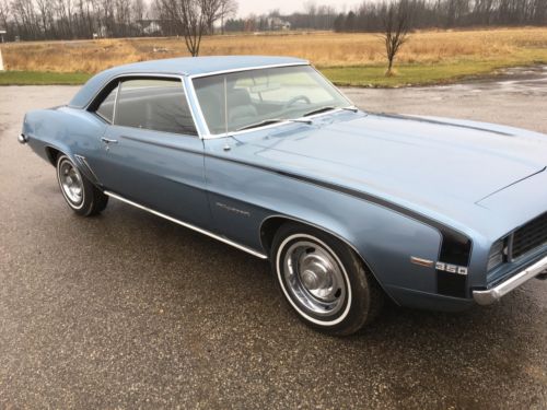 1969 Chevrolet Camaro RS 350 V8 automatic. I won this car in a raffle 4 months ago and will do my best to describe the History and what I do know about the car. I would strongly suggest looking at this car in person but only if you are serious about it or entertaining an offer. 616--218--2476 The previous owner has owned the car since October of 1976 I have the cancelled title for the car from that year that will be included in the sale. Has a 350 motor in it makes a slight ticking noise have not investigated, Rear end seals weep and the normal to be expected weeps on the rear of the motor none of which leaves oil residue on the garage floor. Seats are in excellent condition, interior door skins in excellent condition, Dash Vinyl is starting to curl on the far rh & lh sides against the glass. Glass is also in excellent condition no known chips or scratches. The Vinyl top had been replaced in the late 90's, Some of the car had also been painted at the same time. Paint color is California blue with a dark blue interior. Previous owner said there had never been any rust repair but the painting was for stone chips etc along the lower portion of the car. Car is basically as stock as one would be able to find with original engine,transmission and rear end and I have yet to find one to really compare it to Body is rust free with a few minor blemishes door ding stone chip . Please contact to ask questions if you have any I will do my best to answer them.