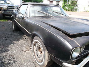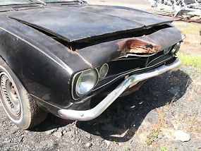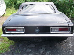 Looking for a super project car?! This is a 1967 Chevy Camaro Convertible ready for a restore. This car was hit on the front nose about 15 years ago and it sat the garage since then. The rear quarters are rusted as shown in the pix. The trunk, floors, and frame are solid (surface rust). The car was just started up today and it runs (needs a starter). Comes with a brand new gas tank as shown in the trunk picture. I'm not sure but I believe the engine is the original, maybe you can tell from the pictures. It has a 6 cyl engine with a 3 speed Manual with Hurst shifter. It has the original keys and clear MA title as well. The interior is complete and nice, just dirty. The convertible top is in great shape with the exception of small tear at the corner. The car is black on black.