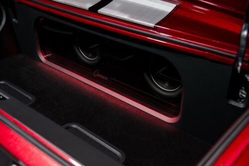 Tremec 6-speed,12-bolt Moser axle and 4.10 gears. Beneath that drivetrain, a completely rebuilt suspension,Detroit Speed subframe connectors and Detroit Speed mini tubs. RideTech Level II 4-link behind RideTech Level II coil-overs, modern power steering and RideTech Level II control arms. 4 and 6-piston Wilwood calipers drilled and slotted rotors Wilwood master . 3-inch, Mandrel-bent exhaust system, which Magnaflow mufflers.