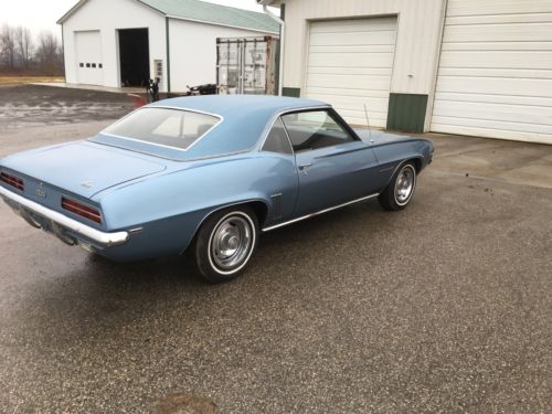 1969 Chevrolet Camaro RS SS 350 V8 automatic if you are looking for a stock unadulterated car this is it I won this car in a raffle 5 months ago and will do my best to describe the History and what I do know about the car. I would strongly suggest looking at this car in person but only if you are serious about it or entertaining an offer. 616--218--2476 The previous owner has owned the car since October of 1976 and at the age of 86 donated it to a local school for a raffle I have the cancelled title for the car from that year that will be included in the sale kind of neat. Has a 350 motor in it makes a slight ticking noise have not investigated but starts runs and drives fine I can see that it has had some recent front brake work and a new battery , Rear end seals weep and the normal to be expected weeps on the rear of the motor none of which leaves oil residue on the garage floor. Seats are in excellent condition, interior door skins in excellent condition, Dash Vinyl is starting to curl on the far RH & LH sides against the glass. Glass is also in excellent condition no known chips or scratches. The Vinyl top had been replaced in the late 90's, Some of the car had also been painted at the same time. Paint color is Glacier blue with a dark blue interior and dark blue stripe plus head light louvers, Previous owner said there had never been any rust repair but the painting was for stone chips etc along the lower portion of the car. Car is basically as stock as one would be able to find with original engine,transmission and rear end and I have yet to find one to really compare it to Body is rust free with a few minor blemishes door ding stone chip . Please contact to ask questions if you have any I will do my best to answer them. I have a walk around video available and several more pictures that I can text 616-218-2476