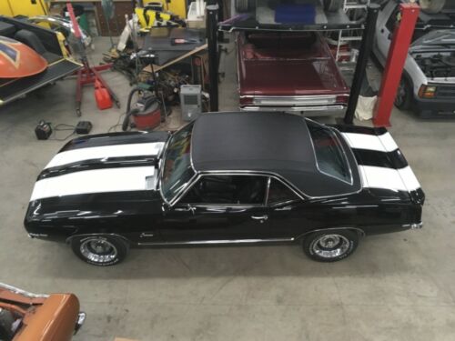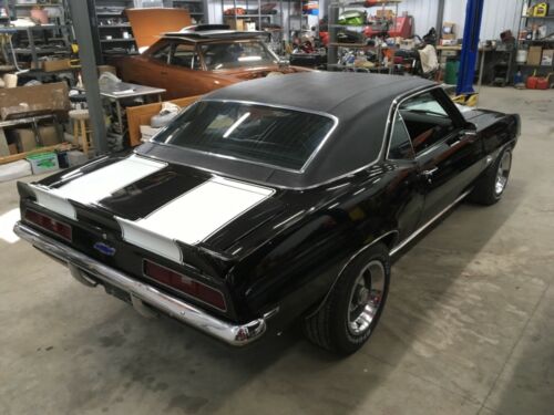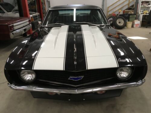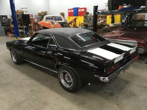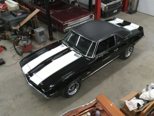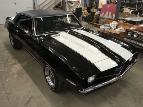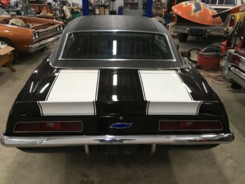 Here is a nice looking and great running '69 Chev Camaro. It has an older re-paint so it has a few imperfections but overall is a very nice car. It is originally from down South and was then brought up North here several years ago and was then used for limited Summer driving. The original color is Hugger Orange and about 20 years ago it was re-painted this sharp looking Black with White stripes color combination that you see here now. It's a solid car with a 350 V8 and a 350 turbo automatic. It has the steel cowl hood, front and rear spoilers, power steering, an original AM radio, center console, 15 x 8 Corvette Rally wheels with BF Goodrich Radial T/A tire's (brand new T/A tire's on the rear)! It is also an original A/C car but it's not functional now. The interior is in excellent condition, the glass is all good, chrome is good, engine compartment is clean, trunk looks great and the underside frame is rock solid.