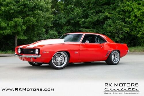 Backing 632 cubic inches of thoroughbred Nelson Racing Engine with a tough Tremec 5-speed and proven Detroit Speed athletics, this tastefully modified Camaro turns a traditionally appealing platform into an off-the-charts super star! Professionally finished by some of Charlotte's best hot rod shops, this fantastic F1 wears a traditional coat of Hugger Orange 2-stage that's highlighted by Pearl White Rally Stripes. Lift the steel hood and you'll find 632 cubic inches of Nelson Racing Engines Hot Rod V8 that, without the aid of the car's polished Alien Intake, turned an incredible 820 dyno-proven horsepower into 770 lb./ft. of tire-spinning torque! Bottom-side, a McLeod RXT twin-disc clutch kicks a tough Tremec TKO 5-speed, which spins a trusty Dana 60 differential. That driveline pushes a full Detroit Speed suspension. Turns come courtesy of Detroit Speed power rack-and-pinion steering. At the corners, Baer multi-piston calipers squeeze Baer drilled and slotted rotors. And power meets the pavement through polished Budnik Cobalts, which spin massive BF Goodrich g-Force T/As. Installed by Mooresville, North Carolina's Hot Rod Interiors by Chuck, this Chevy's tastefully customized cockpit is tailored and taut. Front and center, Recaro-style buckets wear monochromatic leather. Opposite those thrones, a traditional dash features bright Auto Meter telemetry beside controls for modern air conditioning. A custom, full-length console frames a short Tremec shifter. And in front of the driver, a tilting Flaming River column spins a thick Flaming River wheel. Combining incredible performance with timeless aesthetics and an athletic demeanor, this killer custom puts the "class" in world class pro-tourer. Call, click or visit for more information!