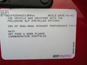 345 HORSEPOWER DUAL PERFORMANCE EXHAUST AND AIR INTAKE, PREMIUM SLP FRONT FLOOR MATS, COMMEMORATIVE GLOVE BOX MATERIAL PACKAGE AND TWO SS KEY FOBS WITH DASH PLAQUE.