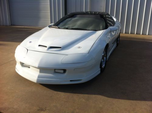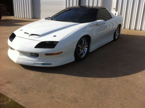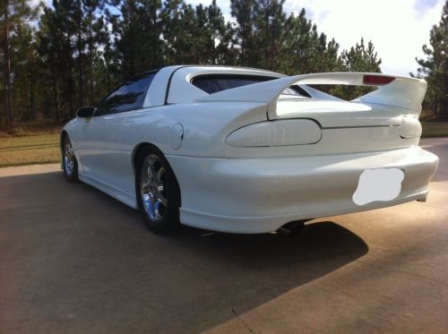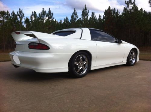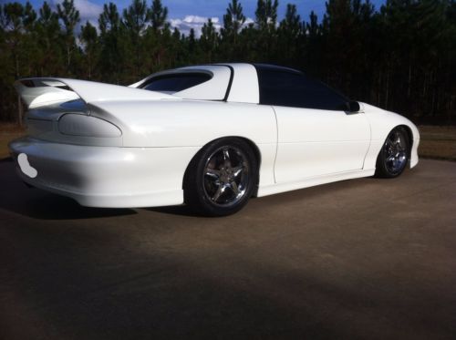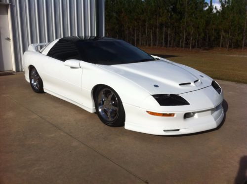Polished Aluminum Fuse box cover, Polished Stainless steel throttle body cover, Chrome (Chevrolet emblem) valve covers, Ported, Polished and Decked Heads, Custom Corvette style (ram air) intake(Fully Functional with Rain Guard), Air ride system(Air Pro 3, installed in 2010), Edelbrock Headers, Taylor 8mm Spark plug wires, Autolite Sparkplugs, MSD 6AL ignition, Emissions Deleted, Polished Fuel Rails, Black outs for all exterior lights painted white (for show only, not functional), Trim molding on exterior deleted, Shaved door handles with keyless remote entry, Shaved front emblem, Shaved rear key hole and camaro emblem, Ground effects all the way around, Rear window deleted with custom SPORTBACK rear window replacement installed(with removable glass), Cam-02 Super wing, 17”x7.5” Superior Scoundrel Chrome rims with Nexon N3000 275-40-ZR17 Rear Tires and Nexon N3000 245-45-ZR17, Extended lower wind deflector for radiator cooling, Hidden (under hood) passenger side mechanical door release, Chrome Shifter Handle, Rear mounted (behind engine) solenoid valves for Nitrous System, Adjustable Fuel Pressure Regulator(set to 45psi if I remember correctly), Stock Bottom End, Spare Tire in place with OEM jack, Nitrous Bottle with Bottle heater and gauge, Fully Functional OEM T-Top holders (with the air tank for the air ride system mounted in that area), Rear mounted air valves (driver side), Control Center in ash tray-(PMS – Performance Mode Switch, H/L – Heater and Light for Nitrous bottle, N – Nitrous Flowing, F – Fans (with ignition switch on), Rdy – System Ready, Red Light on dash – nitrous system is armed), Secret Nitrous Arming switch under dash behind radio, White detail inlay for gauges, Fire Extinguisher in center console, Center Red button on center console(old nitrous arming switch), 5% window tint all the way around, Flowmaster 40 series single in single out 3” exhaust muffler, Custom Rectangular Pan hard rod bar (with polyurethane bushings), Custom Round Control arms(with polyurethane bushings), Air compressor (rear mounted, passenger side, behind rear tire with quick disconnect hook up), 3.73 gears, Cat deleted, Replaced throughout the years – Water pump, thermostat, alternator, compressor(AC and Air ride), Heater core, Removed gas tank in 2010 and cleaned thoroughly.