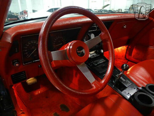 This sexy 1979 Chevrolet Corvette is painted in tuxedo black with a stunning vinyl red interior. T-tops and factory rally wheels add to the sporty good looks. Full instrumentation, four-spoke steering wheel, high back bucket seats and an aircraft-styled center console are standard interior features. Under the hood is 5.7 Liter four- barrel V-8 with dual snorkel air intake and a larger “y" pipe exhaust system for improved performance. The four-speed manual transmission is attached to an all-new (in 1979) rear axle with a 3.55 gear ratio. Independent suspension front and rear, limited-slip differential, power steering and four-wheel power disk brakes were all standard in 1979. Comfort features include air conditioning, AM/FM/cassette radio, power windows and a tilt/telescopic steering wheel.
