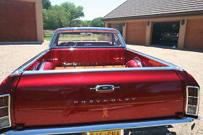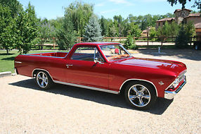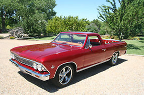 2012 SEMA Show Build; Ebay Motors Challenge; 1966 Chevy El Camino underwent a complete Rotisserie Resto-Modification; Work done by Duran's Quality Paint of Baldwin Park, CA; This car is comprised of mostly brand new equipment; Special Features of this vehicle include: 14 coats of House of Colors Candy Apple Red and 4 coats of Clear; Custom hand painted striping done in gold leaf; Dakota Digital Dash Gauges, Front Disk Brakes/ Cross Driller Rotors, Highway 24 Wiring Kit, GM 350 Crate Motor, 700R Automatic Transmission, Front and Rear Shocks & Springs, New Windows, Felt and Rubber Weather Strips, Custom Ash Wood Bed Kit with Stainless Steel Hardware, Boss 17" Chrome 5-Spoke Wheels on Goodyear Eagle Tires, 3-Core Aluminum Radiator, Optima Red Top Battery, Retro-Sound Radio with MP3 &iPOD Hook up, Kenwood 4" Speakers in Dash, Kenwood 6x9" Rear Speakers, "I Did It" Chrome Tilt Column, Custom 14" Chrome Billet Steering Wheel, Glass Pack Dual Exhaust, Billet Specialities Window Cranks and Door Handles, Rebuilt Wiper Motor, Heater Blower Motor, New Chrome Front and Rear Bumpers, Grill, Window Trim, Rocker Panel Trim and Wheel Well Mouldings, Edelbrock 4bl Carb and Intake, MSD Ignition, New GM Alternator, Power Steering Pump, Water Pump, Fueld Pump, Serpentine Pulley Kit, Tail Lights, HID Conversion Headlights, Red City underdash lights, Custom Camel with Red Piping Interior, New Gas Tank, Trim, Emblems and Window Regulators.This choice El Camino was the Low Rider Magazine People's Choice Winner and was featured in the centerfold of Low Rider Magazine. There is countless documentation of this build on You Tube and Ebay Motors.