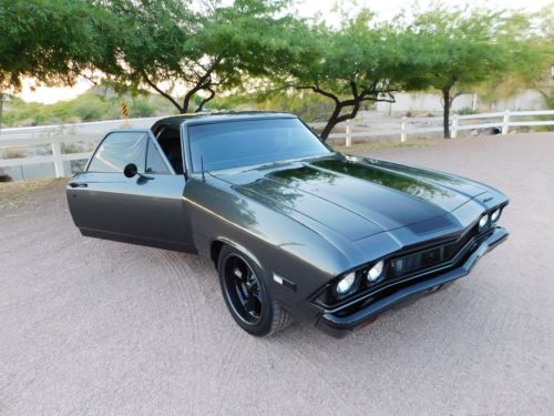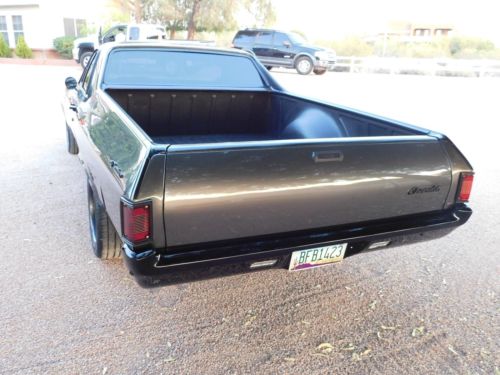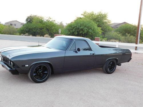 For sale is a freshly restored ground up 1968 Chevrolet El Camino. This vehicle is ready to go cruz’n on Saturday nights and visit your local shows. It has been meticulously restored and is an absolute gorgeous vehicle painted in Mineral gray with ghost black SS stripes. All the trim has been anodized black and the Boyd Coddington 17” custom wheels and bumpers have been painted to match! Stunning. The interior has been redone with first gen. Camaro seats in black imitation supple leather with double blue stitching along with the console being wrapped and double stitched it also has the center section & shifter handle hydro-dipped with a carbon fiber look along with the arm rests and door handles. The dash pad is brand new and the instrument package is an awesome Dakota Digital VHX setup with blue lighting and is a mind blow at night! The steering column was rebuilt and modified for a floor shift unit so no shift lever handle is evident and is topped off with a new Grant wheel. New door panels along with some custom blue stich to match and new suede headliner really compliment the beautiful interior. Behind the seats we have a custom-made speaker box full length that is also wrapped and stitched to match where the Alpine amp and Kicker sub-woofer are mounted. The kick panels in front were also custom made to hold the Alpine component 6” speakers and tweeters. The stereo unit is the classic look “RetroSound” Hermosa series digital MP3, Bluetooth, Pandora ready unit with hands free calling. The pounding sound will be sure to get you rocking in the seat and ready to hammer down on a fresh built Vortec head 350 ZZ crate motor loaded with new components including bearings, rings, HV oil pump, Comp Cams 268 Extreme energy cam, lifters, springs & retainers. The head guides were cut down and PC seals installed. The engine sounds as good as the stereo through new Hedman headers & dual exhaust so you will have to figure out which one to turn up the loudest! It is connected to a newly built 10 bolt 3.55 ratio POSI rear through a freshened turbo 400 with a shift kit and a Hughes GM25 street convertor along with new disc brakes in the rear giving this ride discs on all corners.!All 4 New 2016 & 2017 date code Toyo HP Extensa tires 225/50/17 & 245/45/17