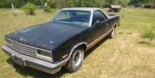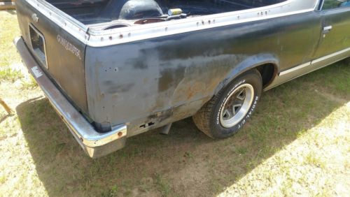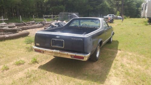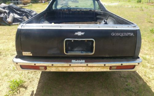 85' ElCamino Conquista Choo Choo Custom Edition Needs Restoration. Factory locking hood. Power Windows(not working) and Power door locks(not working) Frame is Solid! Motor has a bad knock that I believe is from fuel leaking internally from the fuel pump. It has been like that since I've owned the car. Carb needs a rebuild. I always had planned on a motor swap so I never worried about this motor. Transmission shifts fine. Rear end seems fine.Interior is pretty worn out. Headliner was tacked up by previous owner. Someone tried to hack in an old Cadillac radio.Windshield is cracked. Needs Body Work. May need some floor work due to water leaking in at the rear window. Years of debris trapped under the rear window trim has caused this area to rot out a bit. Also looks as though someone fishtailed this beauty and banged up the Pass side rear quarter. Drivers Side fender has a dent at the top of the wheel well. (see pictures) I've always kept this car under cover but have too many projects going on at once, so this one has to go. I have some extra parts that will go with her to include, new door lock sets, and window seals. I did replace the fuel tank and fuel lines, but that was a few years back. This car has been driven around the yard, but that is the extent of it. I wouldn't trust her to go more than five miles down the road, with that II will say that This car will need to be transported. I do not have a title for this car so check locally what your state's requirements are. In CT you only need a Bill of Sale for cars OVER 20 YEARS. Once again, this car will have to be transported! Winning bidder is responsible for all costs and arrangements for Shipping, etc. I can help load. May have some more parts and stuff I will have to look. This is a 32 year old car/truck, that needs total restoration, if you do not know what that means then perhaps this isn't the car for you. I'm not trying to insult anybody, that's just the way it is. Please don't ask me questions like, "What's wrong with it?" I've tried to be as descriptive as possible. This will be great project for someone. This car is also listed locally. Thanks for looking!