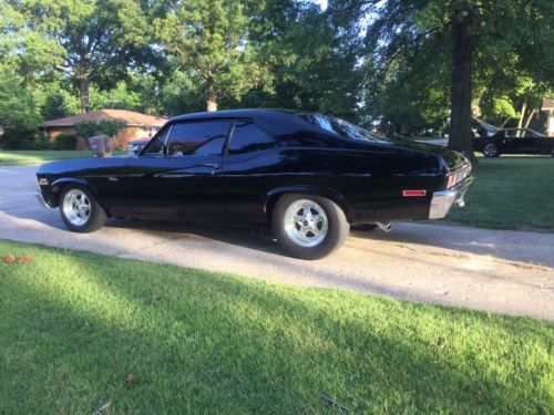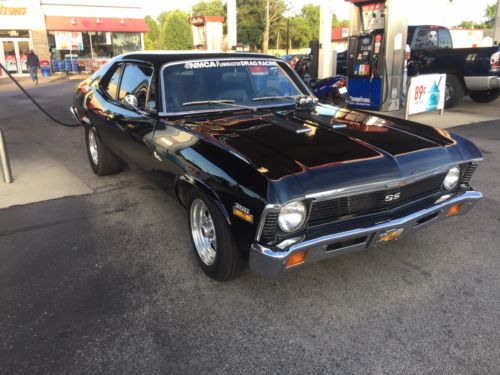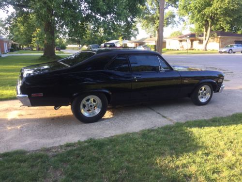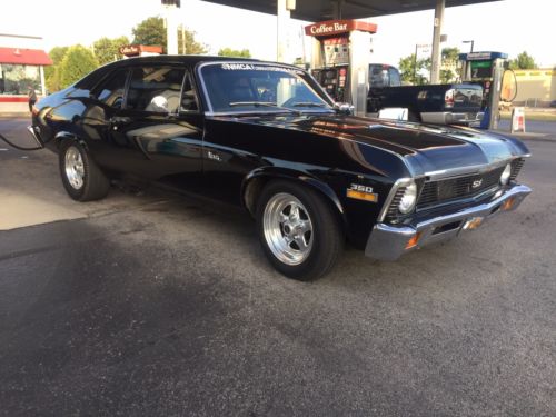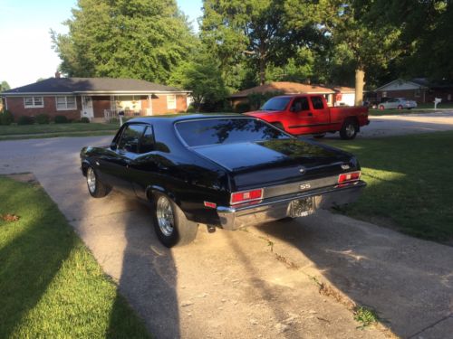 This 72 Nova is a absolute rust free Texas body. Built with the best components. Shimmering Black on a straight all original sheet metal. Set up with Maroso suspension for street or strip, Engine is a high dollar pro built destroked 400. its 377 cubic inch with forged crank, rods,13.5 pistons,aluminum heads,big cam,roller rockers,balanced/blueprinted,Holly carb.550 hp. 3500 stall, Built Turbo 400,373 Posi. 3" exhaust with high quality elec. cutouts and Flowmasters New Vintage Air A/C All black interior with new Procar seats. She runs low 7's in 1/8 and you drive her there and back home. Dressed as real SS it is a winner at shows. Jerry 812-249-5727.