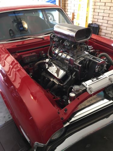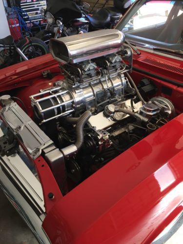 The motor that is in this vehicle is a thing of beauty. The basic information on the motor is that it is a Chevrolet 454 4 bolt main that has been line bored .60 over which makes it a 468. The supercharger is a Weiand 8-71 and the motor is supplied fuel by TWO 950cfm Holley double pumper carburetors. The exhaust note is provided by ceramic-coated Hooker Competition headers feeding into 3" Flowmaster 40 mufflers. The motor is cooled by a Be Cool cross flow aluminum radiator which has no issues cooling this vehicle in any driving conditions. The transmission is a reverse pattern TCI Turbo 350 with a Hurst shifter rated to 1000 Horsepower with manual shift capabilities. The convertor is a 3500-stall TCI. It is also equipped with a trans-brake and a supplemental transmission cooler.