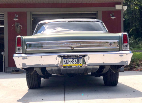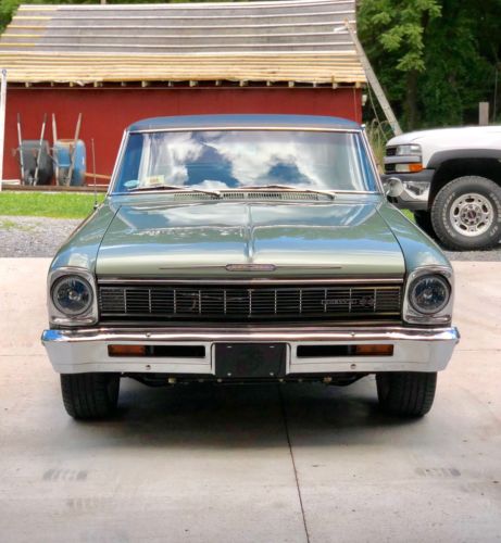 1966 Chevy Nova SS. 8,889 miles on total restoration. OriginalCalifornia car has power steering, all 4 power disk brakes, air conditioning,all newer interior from carpet up to the headliner to seats. All parts new orrestored to original. New tinted glass and weatherstripping throughout. Has new 17x7 American Racing wheels with 225/45 tires in back and 215/45 in front. Has a newer 327 engine andrebuilt 2004r trans overdrive and newly rebuilt 3.73 Posi 10 bolt rear end. Factory willow green with black vinyl roof. Paint and body is good shape - minor imperfections. Has complete church boys racing front suspension with their coil-overadjustable shocks. Magnaflow duel exhaust exit outback. Everything on this car works!