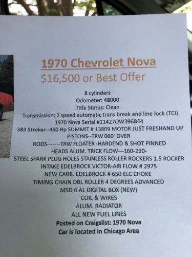 1970 Chevrolet nova 2 speed hydramatic 383 stroker 450 horse power summit motor Got lights for driving on the street. 488 spool rear end.Two speed Hydromadic transmission with line lock 3500 stall speed converter.No rust low mileage car call me for more information thank you Donny 630-280-5643