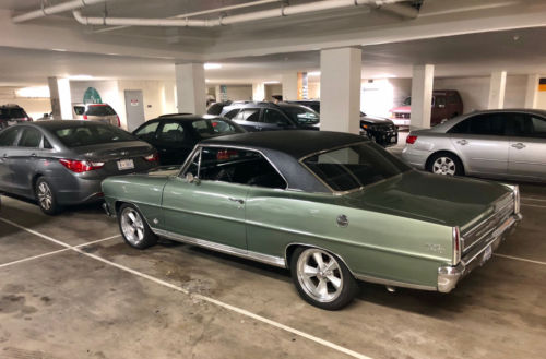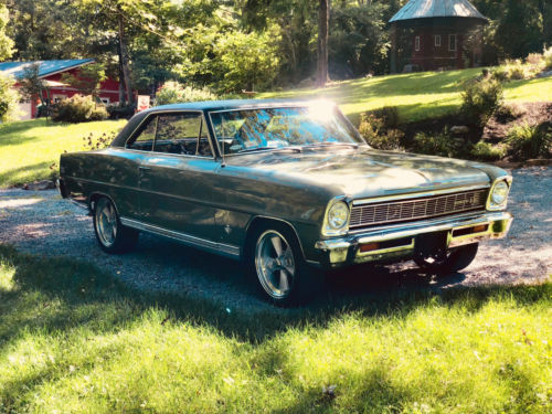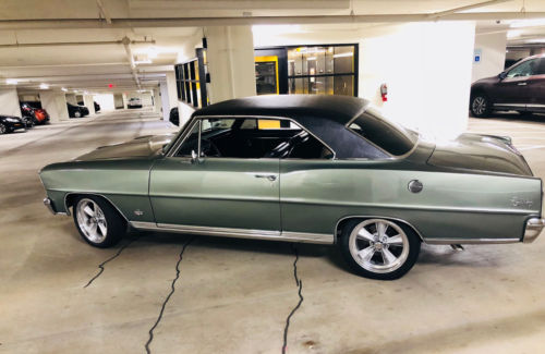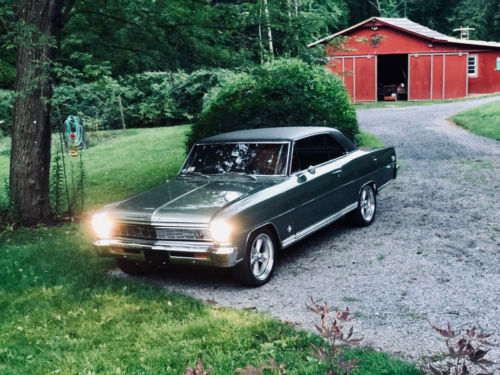 1966 Chevy Nova SS. 8,889 miles on total restoration. OriginalCalifornia car has power steering, all 4 power disk brakes, air conditioning,all newer interior from carpet up to the headliner to seats. All parts new orrestored to original. New tinted glass and weatherstripping throughout. Has new 17x7 American Racing wheels with 225/45 tires in back and 215/45 in front. Has a newer 327 engine andrebuilt 2004r trans overdrive and newly rebuilt 3.73 Posi 10 bolt rear end. Factory willow green with black vinyl roof. Paint and body is good shape - minor imperfections. Has complete church boys racing front suspension with their coil-overadjustable shocks. Magnaflow duel exhaust exit outback. Everything on this car works!